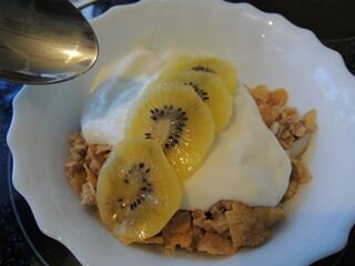 朝のヨーグルトとシリアルとkiwi
